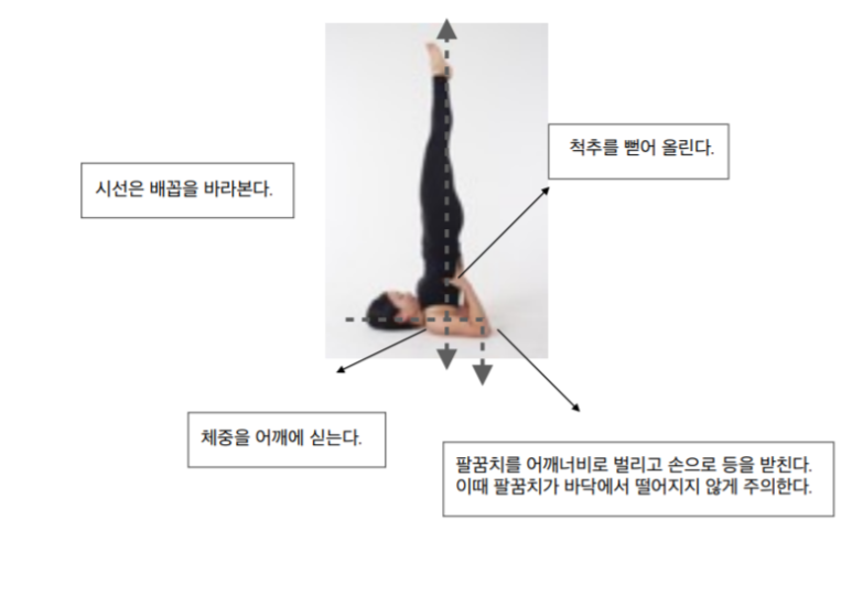 Salamba Sarvangasana(sala mba 지지, sarvanga 몸의 전체 부분) 견고자세-갑상선을 자극하여 순환계, 소화계, 생식계, 신경계, 내분비계의 균형을 잡는다.- 뇌의 혈류를 증가시키는 동시에 정신적 감정적 스트레스를 줄이고 심리적 불안을 없애는 데 도움이 된다.- 갑상샘, 간, 비장의 비대증, 경부척추염, 디스크탈출증, 심장질환, 눈이 약한 혈관, 혈전증이 있는 사람은 이 자세를 수련하지 않는다.