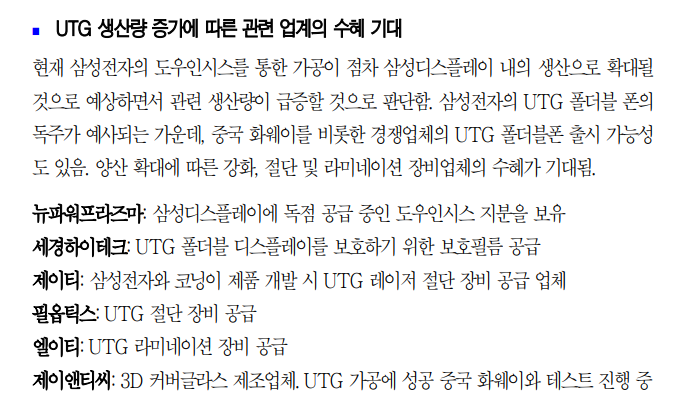 [출처 유진투자증권] 3. 유진투자증권에서 내년에 출시되는 UTG 관련 스마트폰 생산량 증가에 따른 수혜기업에 대해 언급하고 소개한다. 뉴파워 플라즈마, 세경하이테크, 제이티, 필옵틱스. 엘이티, 제이앤티씨 등이다. 본격적인 양산에 돌입한다고 판단된다고 하니 주목된다.