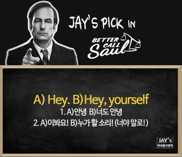 이미지 출처 : 미드 – Breaki ng Bad – Hey. – Hey yourself. – 안녕. – 안녕 (약간 불편하고 어색한 상황에서의 인사)
