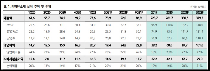 앞서 살펴본 것처럼 PI필름이 사용되는 산업군 자체가 성장함에 따라 수요는 늘어날 것으로 예상된다. 그러나 시장점유율 1, 2위 업체 모두 공급을 조절하고 있어(설비투자한 것이 아직 공급으로 이어지지 않았다) PI필름 가격 상승에 따른 영업이익률 증가가 예상된다.